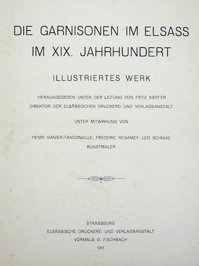 Nach den vorliegenden bibliographischen Angaben brachte Fritz Kieffer von der Elsässischen Druckerei und Verlagsanstalt um 1905 ein zweibändiges Mappenwerk unter dem Titel "Die Garnisonen im Elsaß im XIX.Jahrhundert" heraus. Inhalt waren 100 Bilder französischer Einheiten von diversen französischen Militärmalern.