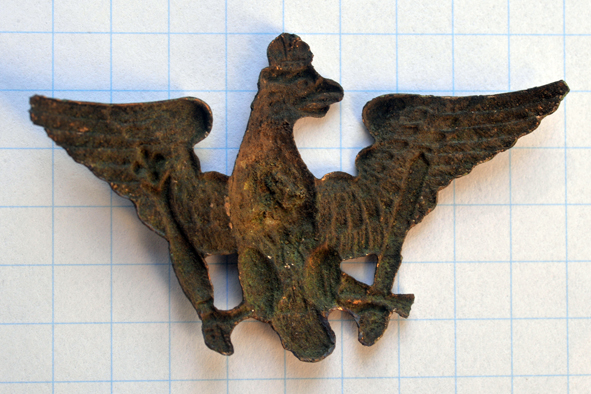 aufgrund der Größe könnte es sich um einen Adler des preußischen Dragoner-Regiments 2 handeln, der vermutlich 1815 von Regiment selbst beschafft und an den Feldmützen in dieser Form bis 1850 getragen werden durfte. Die Chiffre FWR bezieht sich daher auf König Friedrich Wilhelm III..
