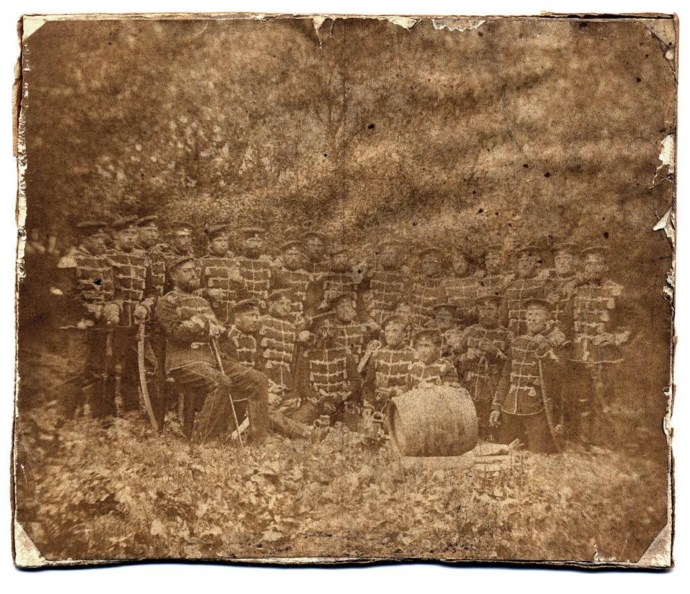 Der Herr ganz links ist übrigens Militärmusiker (Trompeter). Der vermutete Zeitpunkt der Aufnahme ist wohlmöglich korrekt, denn die Husaren tragen noch den Kavalleriesäbel M 1811, also den so genannten "Blüchersäbel". Ab 1852 wurde dann der Kavalleriesäbel M52 schrittweise eingeführt und 1857 vollständig abgeschlossen.