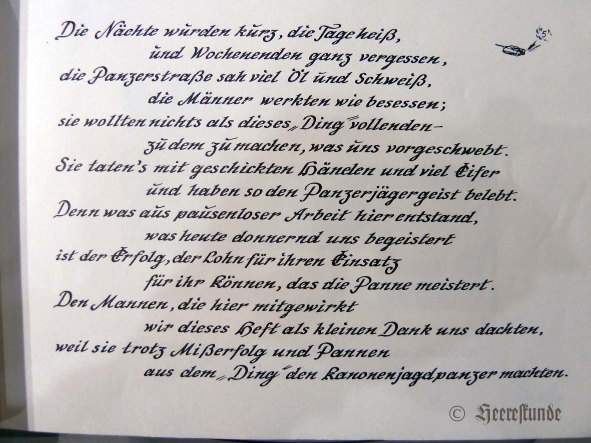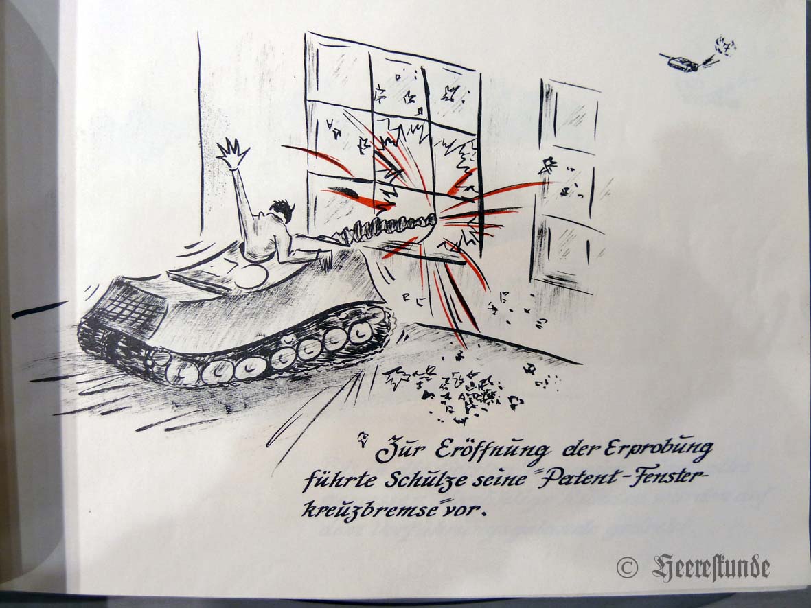 Das hier im Heereskundeforum vorgestellte Exemplar einer sicherlich nicht ganz ernst gemeinten „Erinnerungsschrift“ dürfte aus einer Kleinstauflage stammen. Gewidmet war es Dr. Kosack vom Spezialstab der Kampftruppenschule III der Bundeswehr in Munster. Ohne Orts- und Jahresangabe, dürfte das Heft einen Querschnitt der Erprobung vom Winter 1960 bis ca. 1963 abbilden. Die Wiedergabe der Schrift erfolgt hier ausschnittsweise.
